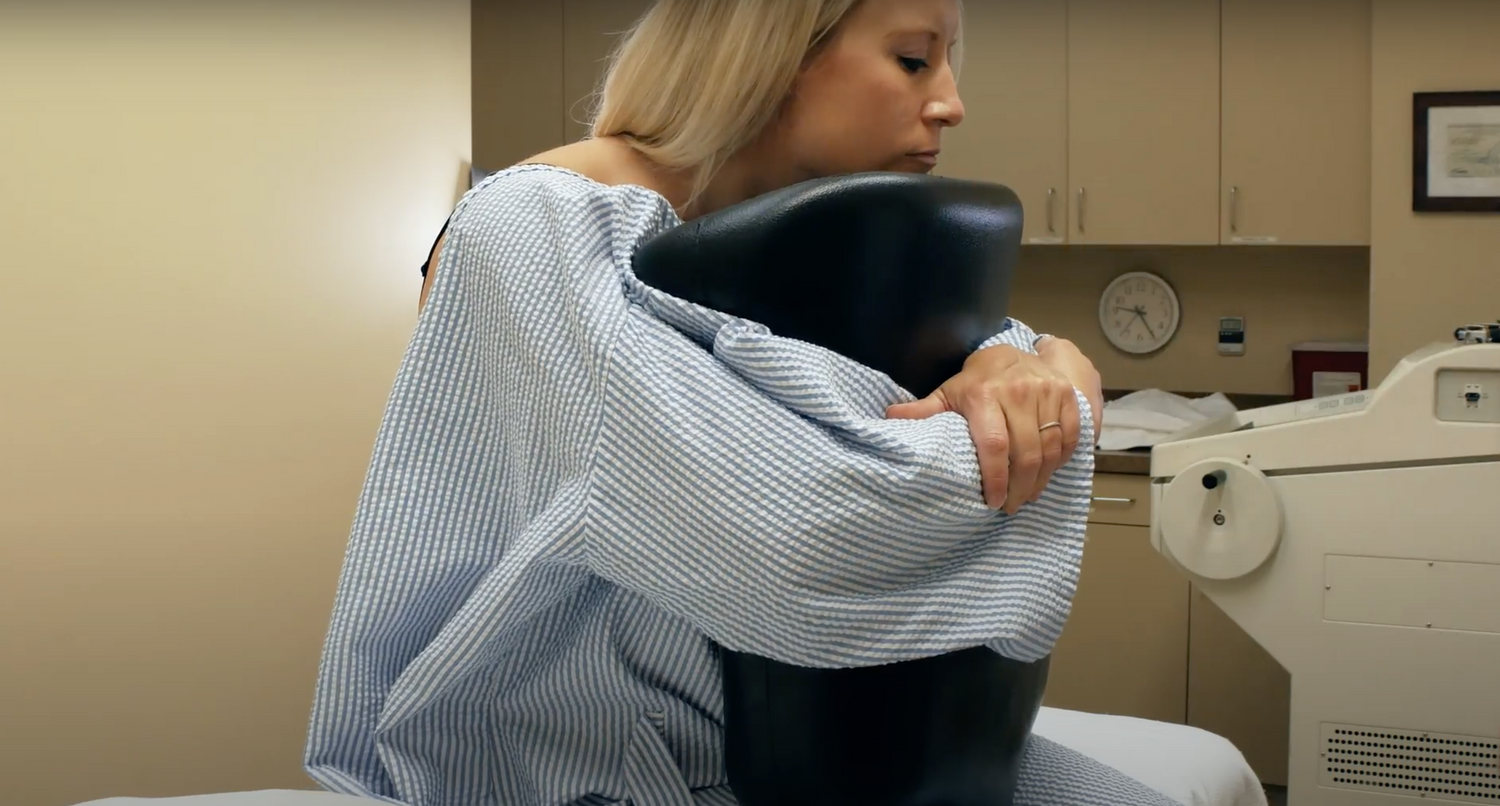 In addition to facilitation of proper positioning, the foam maintains a density that allows for adequate support but is soft enough to allow for the patient to squeeze or “hug” the device and serve as a distraction technique for the patient while undergoing the procedure with the goal to decrease pain and anxiety. It has been effectively demonstrated that distraction techniques are useful in this regard for other needle-based procedures such as venipuncture.3